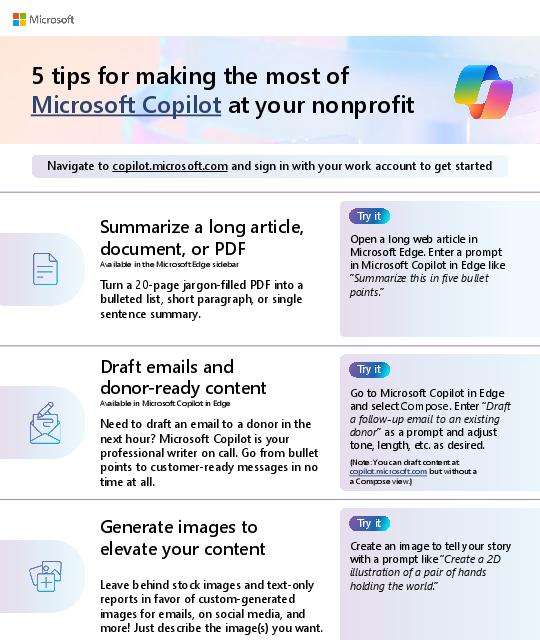Nonprofits want to see real, usable value from AI tools. This infographic outlines five ways to get started with Microsoft Copilot, including drafting donor communications, summarizing dense content, and generating custom visuals.